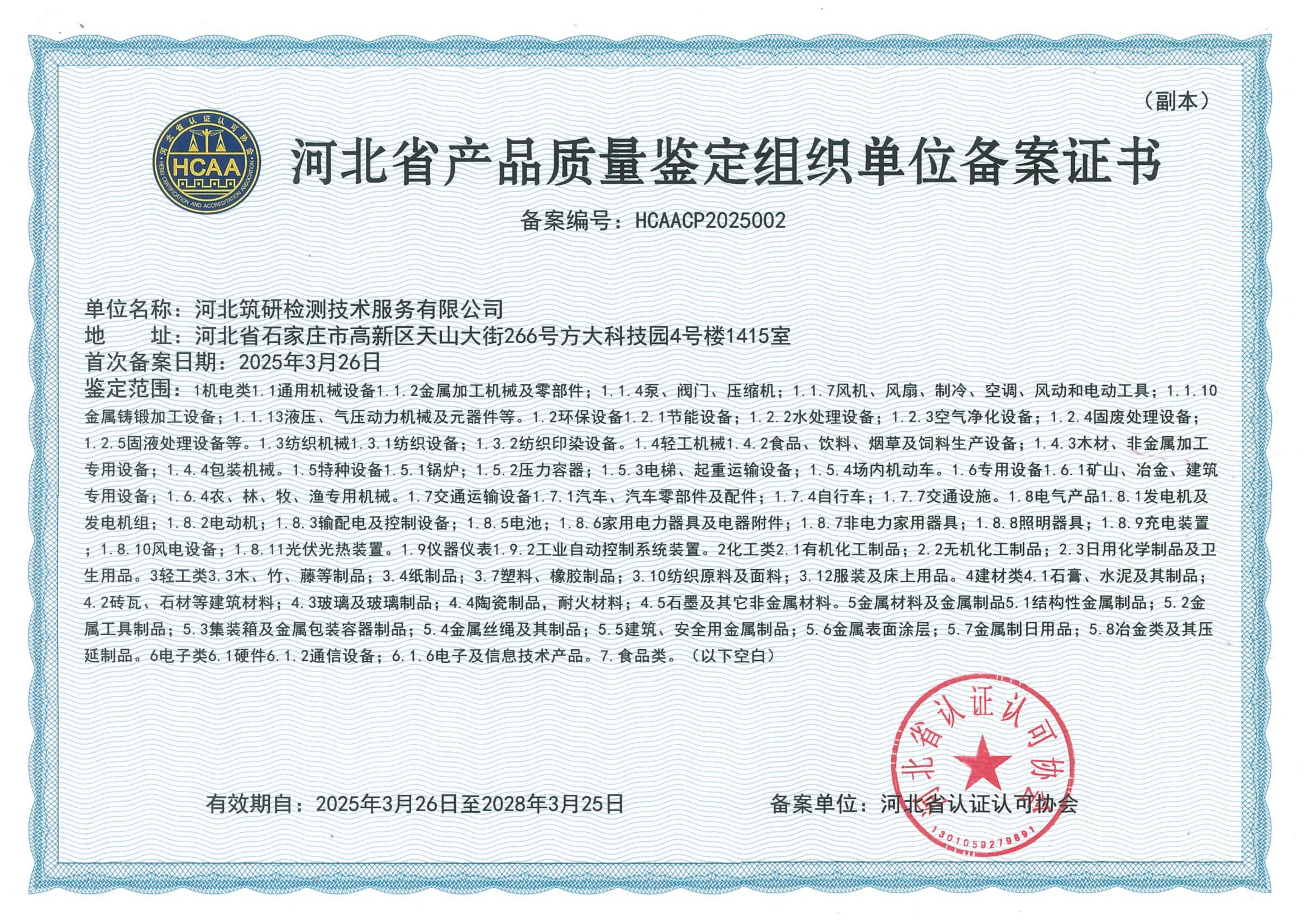 清徐河北省产品质量鉴定组织单位备案证书