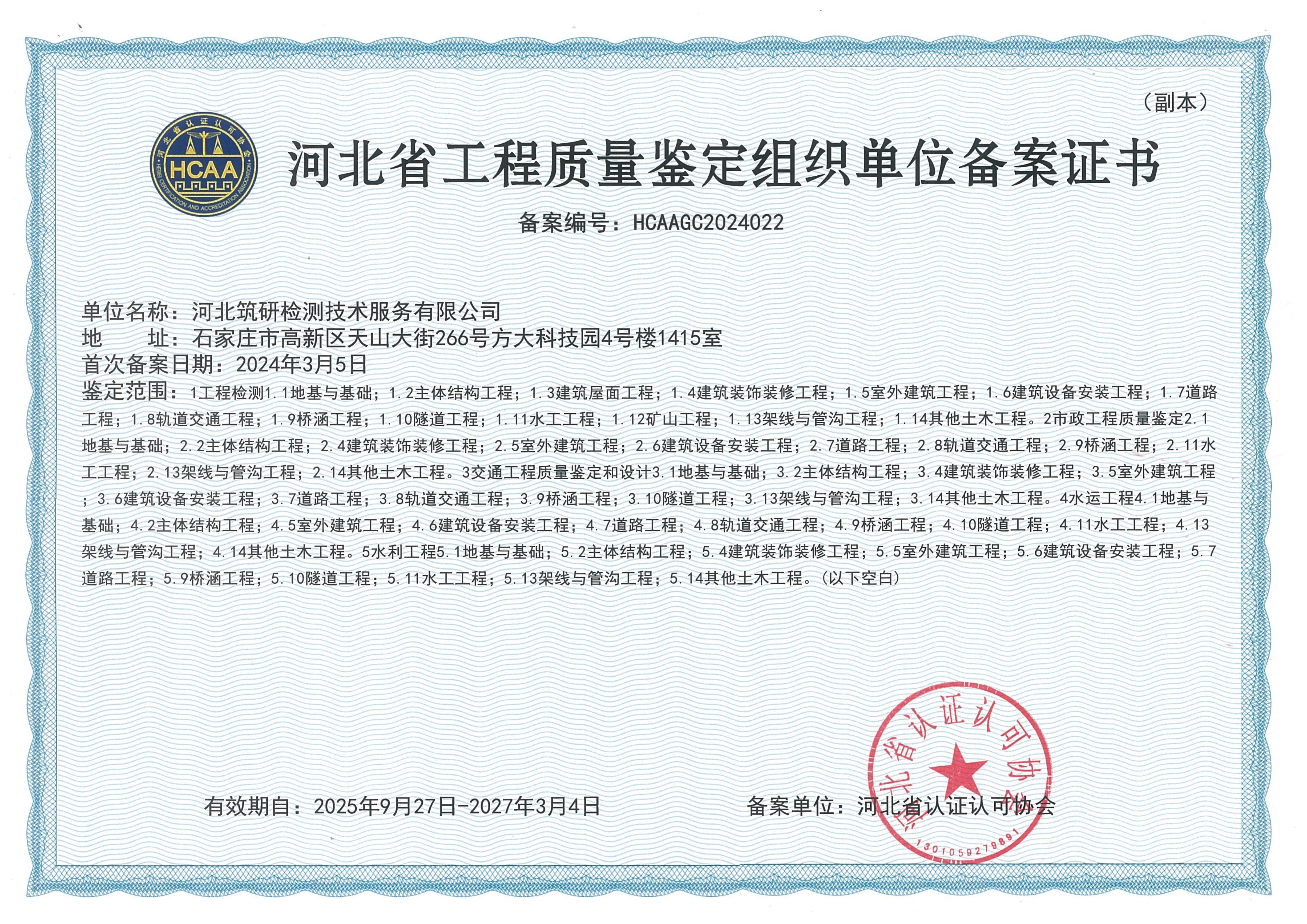 清徐河北省工程质量鉴定组织单位备案证书